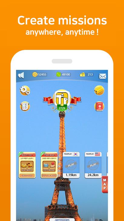 ♣ ' TOURPLAY ' (http://www.tourplay.zone) é um jogo de eventos em que os usuários podem criar e jogar o jogo da missão nos locais em que estão localizados atualmente usando o aplicativo. Este jogo é um jogo funcional em que os usuários selecionam a área do jogo no local atual ou no site específico do destino e tempo de marca, tipo, missão, recompensa e penalidade do jogo, usando suas informações geográficas/localizadas/multimídia.
