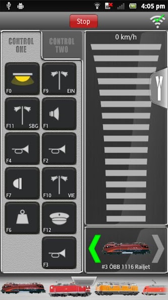 O controle do modelo de trem nunca foi tão fácil e conveniente: com um toque de sua mão, você pode rolar para o seu modelo de escolha na biblioteca de locomotivas. Um pequeno toque no símbolo do farol e na frente e nas luzes de fundo continuam. Um segundo toque, desta vez no símbolo do alto -falante, e a locomotiva faz um som. Arraste o dedo sobre o indicador de velocidade e o trem acelera.