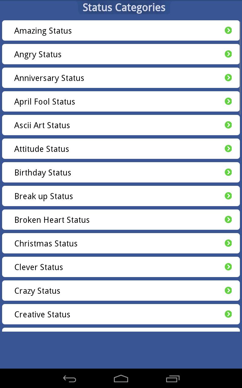 Категории прямо из удивительного, злого, годовщины, апрельского дурака, искусства ASCII, отношения, дня рождения, разрыва, разбитого сердца, Рождества, умного, сумасшедшего, креативного, влюбленного, милого, смелости, порядочного, эмоционального, обруча, экзамена, флирта, еды, дружбы, смешных, девочек и мальчиков, удачи, доброго утра, спокойной ночи, привет, индивидуального, поцелуя, жизни, любви, скупых, мотивационных, naud, Newge, New Year, New Year, New Year. Романтические, грубые, грустные и так далее доступны в этом приложении.