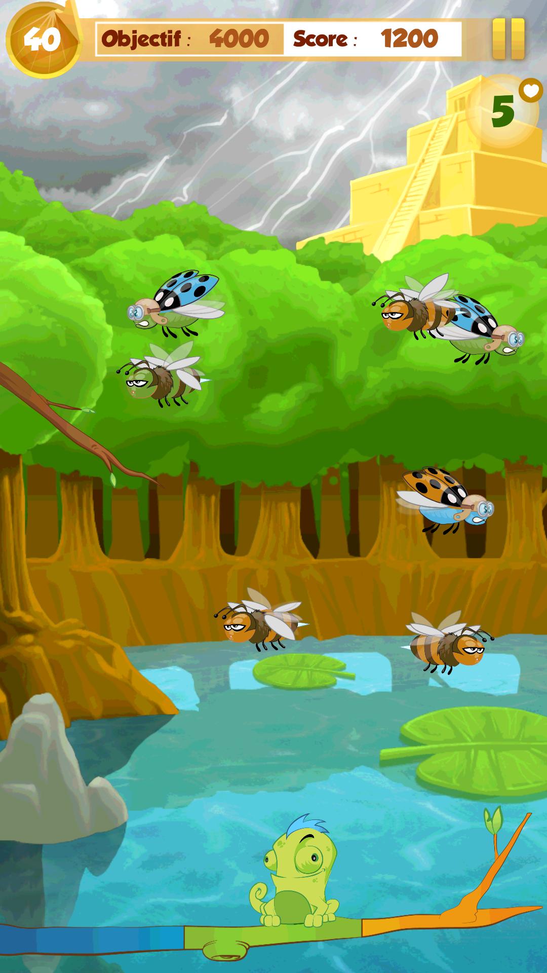 Посмотрите внимательно насекомые, их цвета и их защиту. Перемещайтесь через ветвь, чтобы забрать свой цвет, чтобы поймать насекомых с теми же цветами, что и ваш хамелеон.