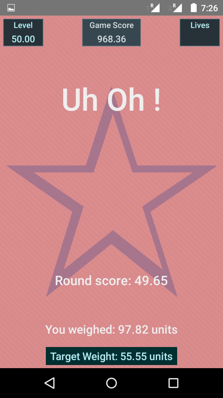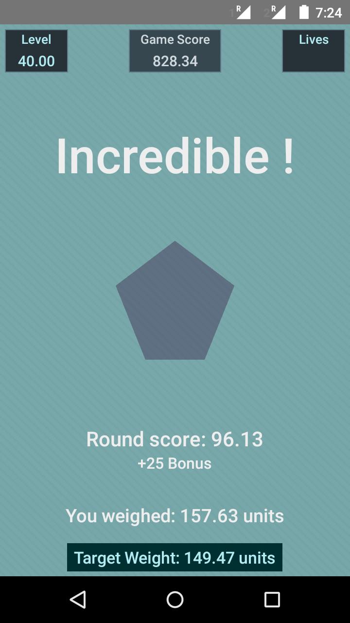 Простая и удивительно сложная концептуальная игра, которая будет держать вас в течение нескольких часов. Вы должны нажать на свой прикосновение и удержать, чтобы увеличить вес разных форм, пока вы не думаете, что они как можно ближе к целевому весу. Чем больше раундов вы проходите, тем сложнее становится. Секрет заключается в выпуске прессы в нужное время для каждой формы. Хотя это может выглядеть просто в первом ходе, вам будет тяжело овладеть актом взвешивания форм. Так вы готовы стать лучшим чемпионом?