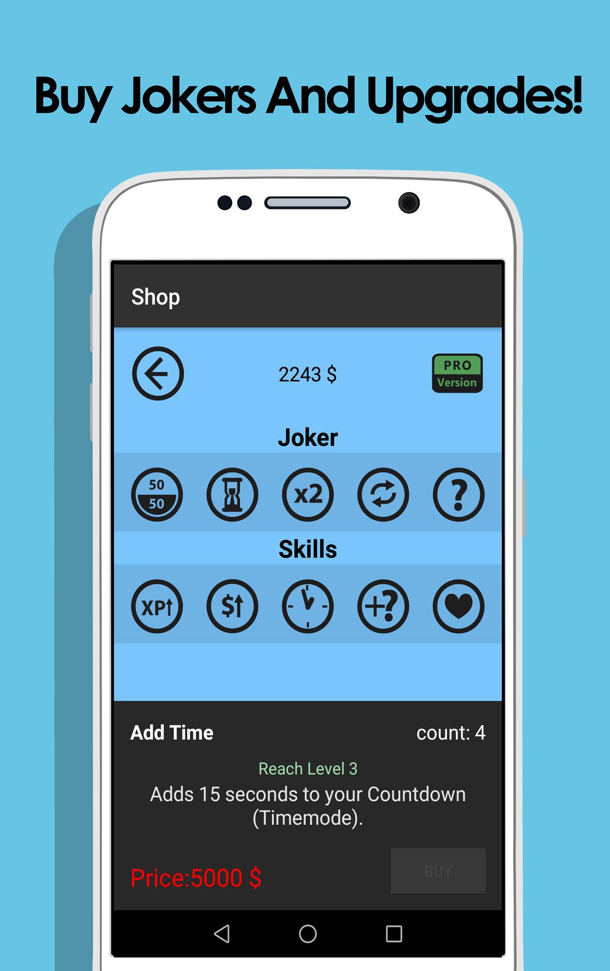 Все знают 50/50 Joker. Викторина позволяет вам разблокировать больше Jokers, которые помогут вам ответить на вопросы, попробовать вторую попытку, добавить время к своему обратному отсчету или переключить вопрос. Кроме того, обновления помогут заработать больше денег и опыта или позволить вам оживить после того, как дать неправильный ответ. Станьте богатым и купите все, что помогает вам стать умнее! Таким образом, отвечать на угадание и вопросы с изображением, может быть намного проще! Ни одна другая бесплатная викторина общих знаний не предлагает такого разнообразия в 2019 году!