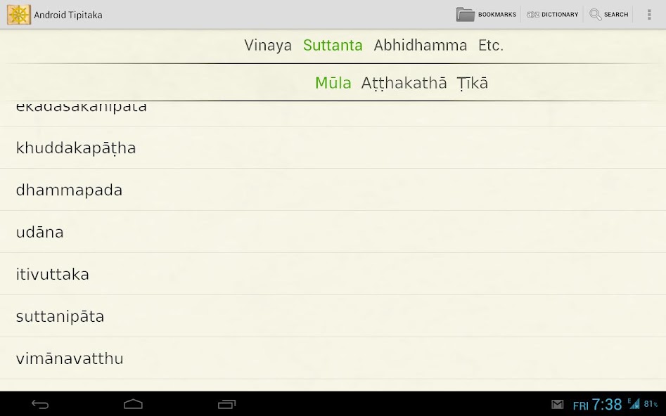Tipitaka для Android-это приложение для чтения буддийской пали-пали Thuravada Pali Tipitaka , комментариев и суб-создателей в Пали. Он подходит для продвинутых студентов языка пали, поскольку он не включает переводы на английский язык. У него есть несколько палианговых словарей.