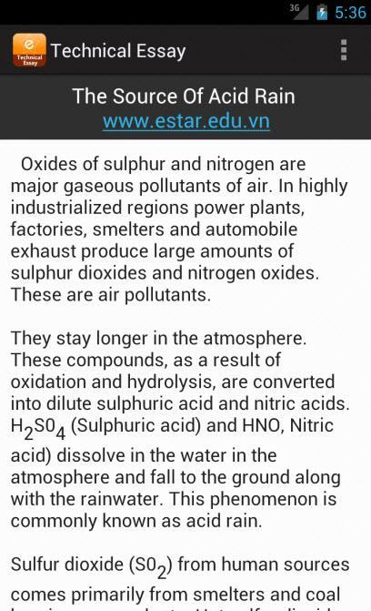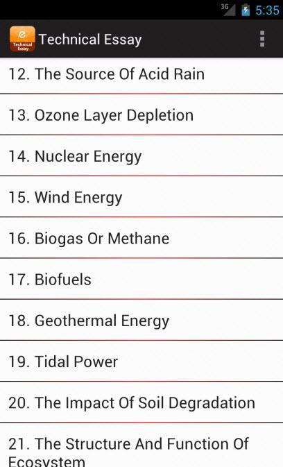 This application has 130 essays of technical topics. You can find topic like: wind energy, nuclear energy, acid rain, aquatic ecosystem,… Read these essays when you have spare time to learn more technical words.