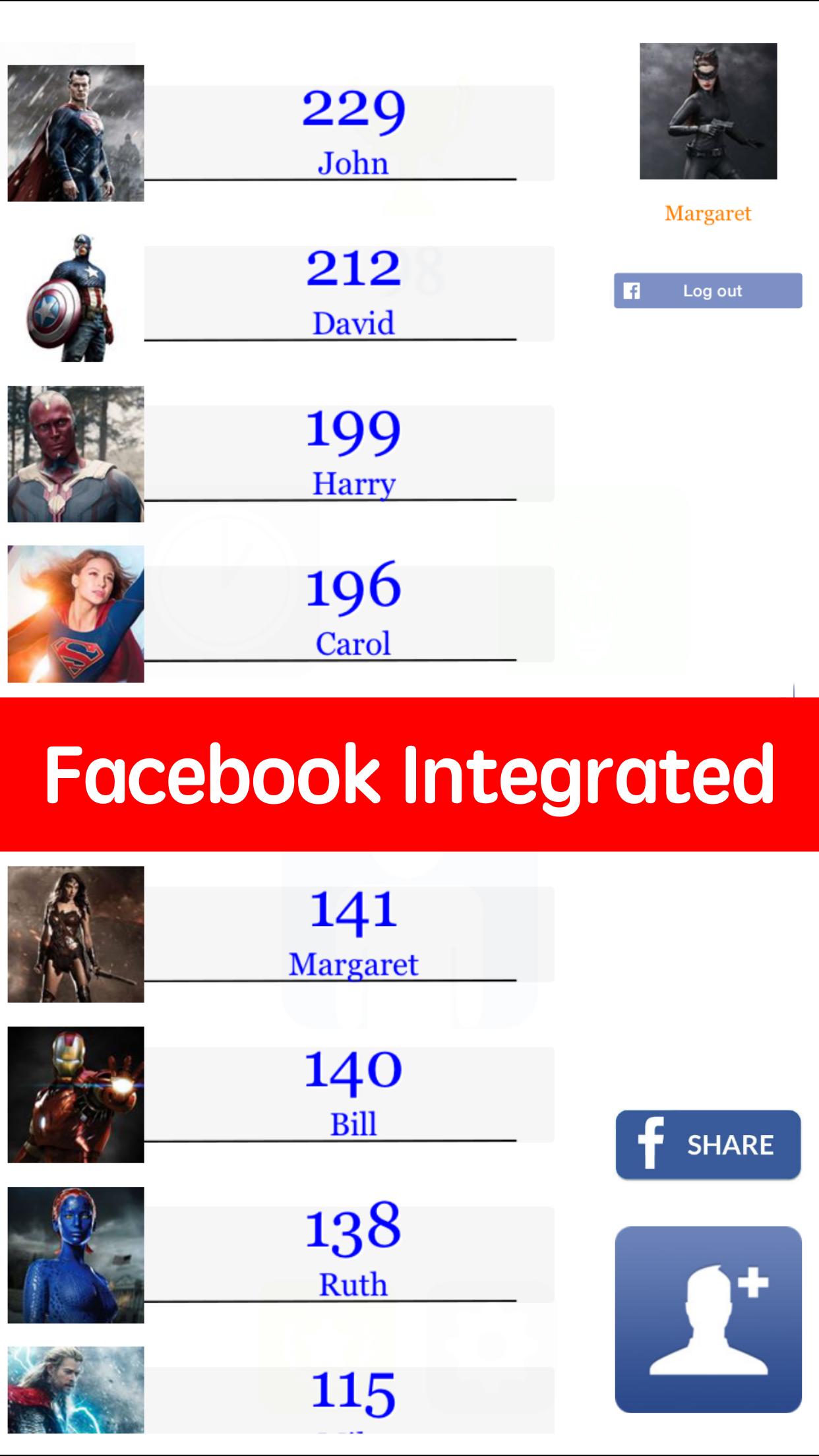 - รวมฟังก์ชันการทำงานของ Facebook เช่น Share to Friends เชิญเพื่อนท้าทายเพื่อนและโพสต์คะแนนไปยัง Facebook