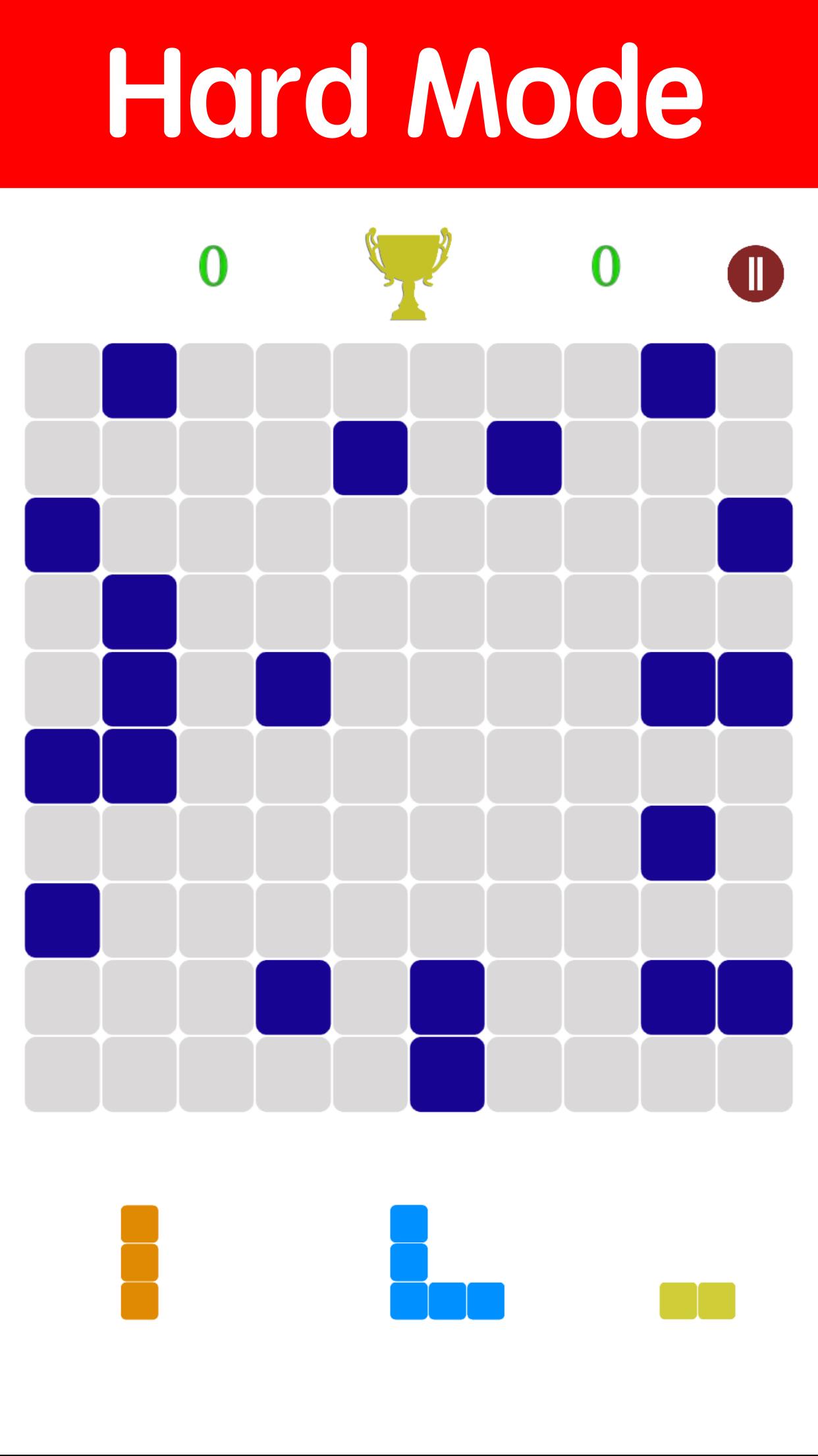 - ในโหมดฮาร์ดเริ่มต้น 20 บล็อกที่วางแบบสุ่ม หากบล็อกน้อยกว่าหรือเท่ากับ 10 บล็อกจะมีการวางบล็อกอีก 10 บล็อกและได้รับคะแนนเพิ่ม 100 คะแนน