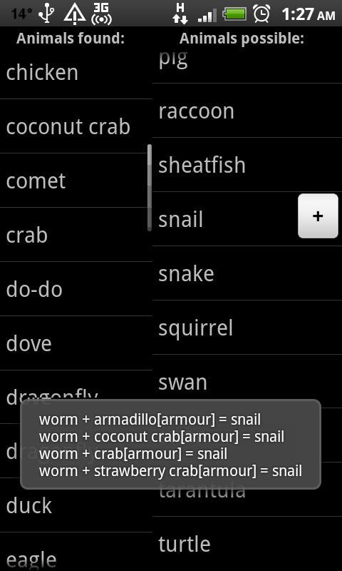 การแก้ไขปัญหานี้คือการไม่โหลดคอมโบลงในหน่วยความจำ (มีชุดค่าผสมประมาณ 58,000 ชุด BTW) แต่คำนวณค่าผสมที่มีอยู่ครั้งแรกเท่านั้นนั่นคือแสดงสัตว์หนึ่งตัวเท่านั้นที่คุณสามารถทำได้ สิ่งนี้จะลดการใช้หน่วยความจำและการใช้งาน CPU โดยการคำนวณคอมโบทั้งหมดคุณจะรออายุเพื่อหาพวกมันเมื่อคุณเพิ่มสัตว์ใหม่