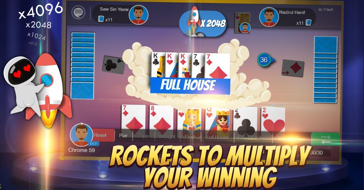 - เพื่อให้เกมน่าตื่นเต้นยิ่งขึ้นบางส่วนของมือที่เล่นในการแข่งขันจะทำให้เกิดจรวดหรือไม่? จรวดแต่ละอัน? จะเพิ่มชิปทั้งหมดที่ผู้ชนะชนะอย่างมากด้านล่างเป็นมือที่สูงซึ่งจะกระตุ้นจรวดหรือไม่? -