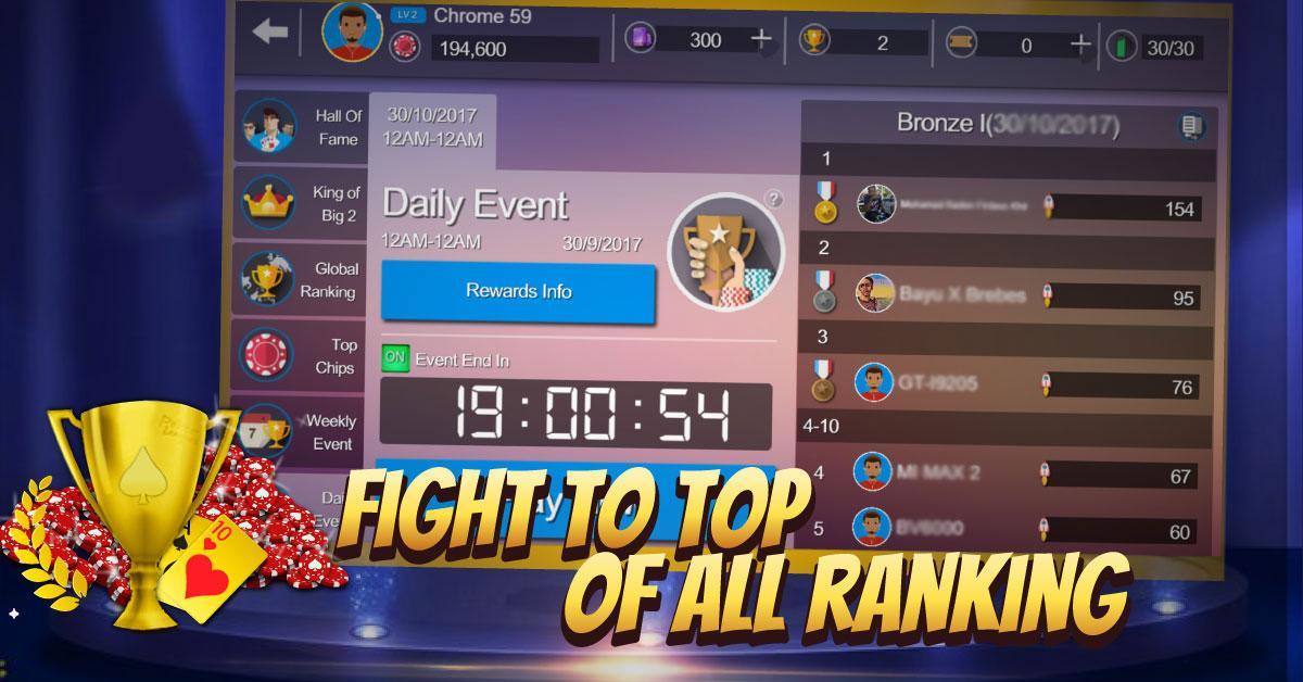 - Big Two (เรียกอีกอย่างว่า Deuces, Pusoy Dos และชื่ออื่น ๆ Big 2, 大老二, 鋤大 d, 步步高升) เป็นเกมไพ่ที่คล้ายกับเกม Crazy Eights ผู้ชนะ拱猪, 斗地主, 升级, 升级, 升级, 升级, 升级, 升级, 升级, 升级, 升级, 升级,