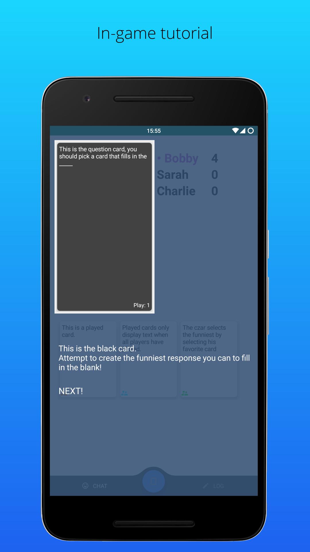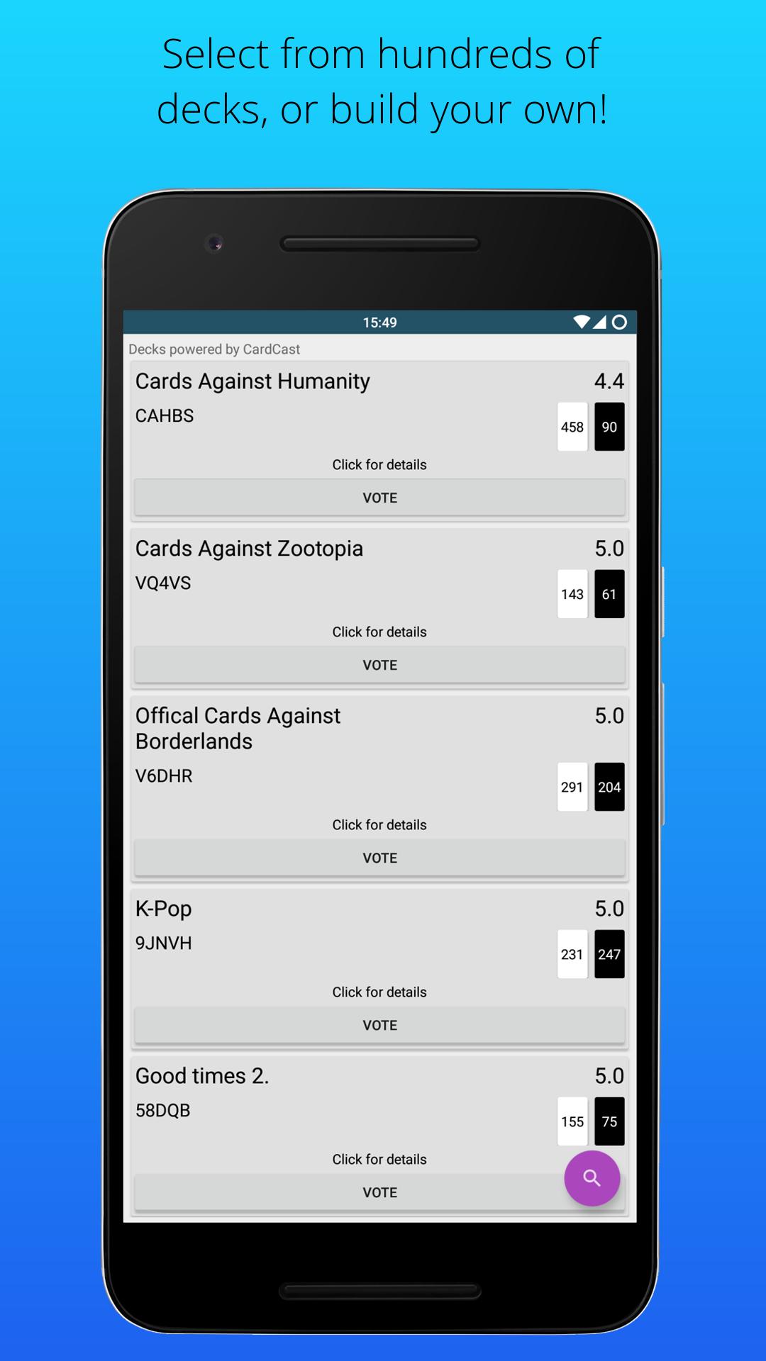 เรารองรับสำรับการ์ดที่กำหนดเองเพื่อเล่นกับการ์ดโปรดของคุณคุณสามารถเล่นกับชุมชนที่ส่งผ่านดาดฟ้าหรือสร้างดาดฟ้าของคุณเองเพราะแน่นอนว่าคุณเป็นคนตลก