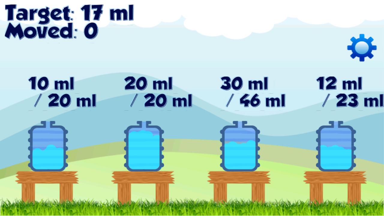 คุณต้องจับคู่ปริมาตรเป้าหมายโดยการเทน้ำจาก 1 ขวดไปยังขวดอื่นขวดแต่ละขวดสามารถเก็บปริมาณน้ำที่แตกต่างกันได้หากการเทไม่สามารถแก้ปัญหาได้