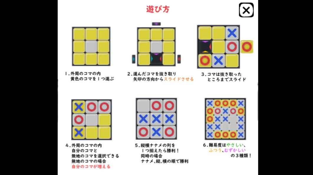 มันเป็นเกมที่คุณแบ่งออกเป็นสองแคมป์ 〇x และเลือกชิ้นส่วนรอบตัวคุณแล้วเลื่อนมันเข้ามาจากฝั่งตรงข้ามเพื่อจับคู่ 5 แต้มก่อนคู่ต่อสู้ของคุณ