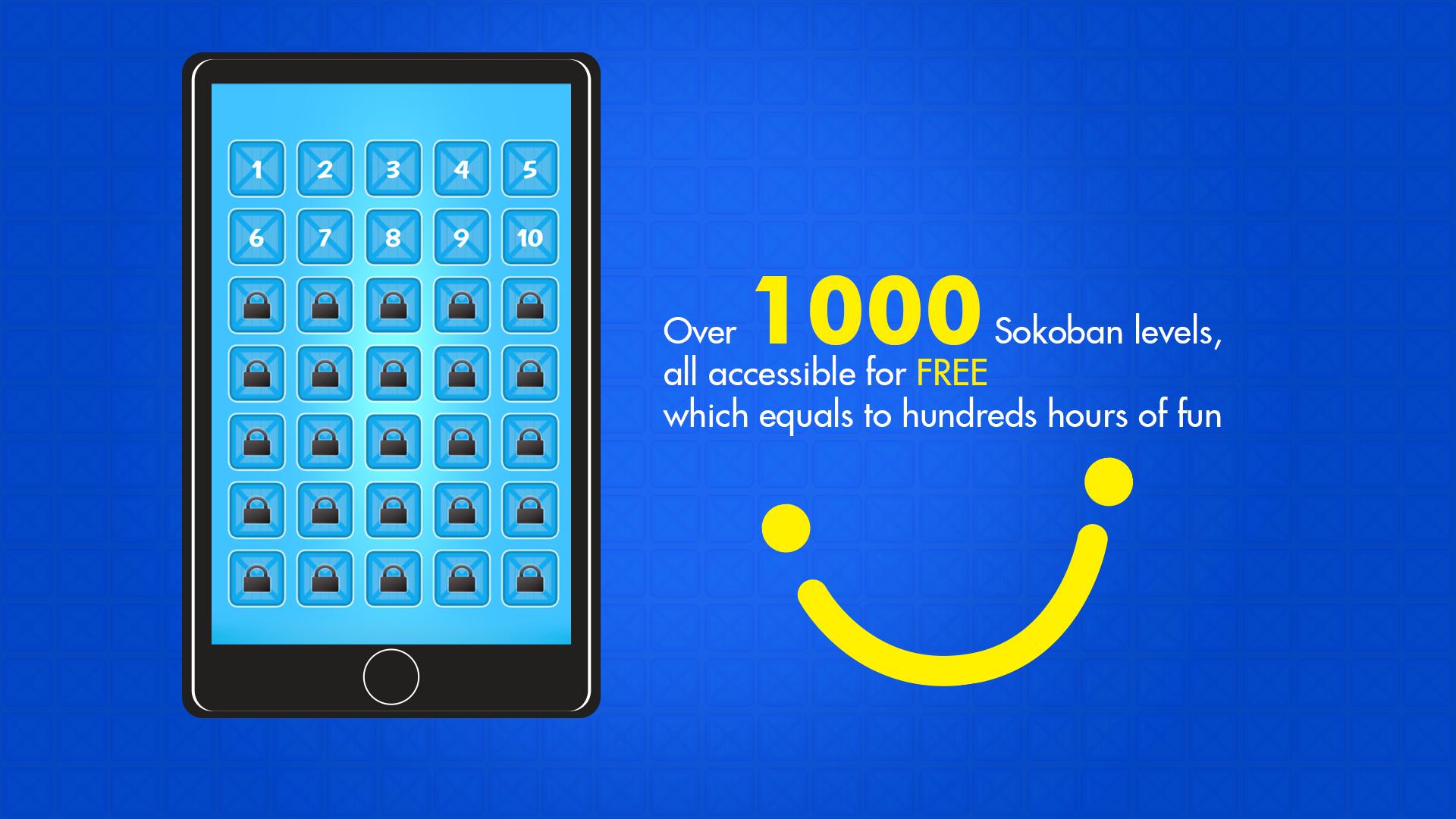 - ระดับ Sokoban มากกว่า 1,000 ระดับสามารถเข้าถึงได้ฟรี (ไม่จำเป็นต้องจ่ายเงินใด ๆ ) ซึ่งเท่ากับหลายร้อยชั่วโมงแห่งความสนุก