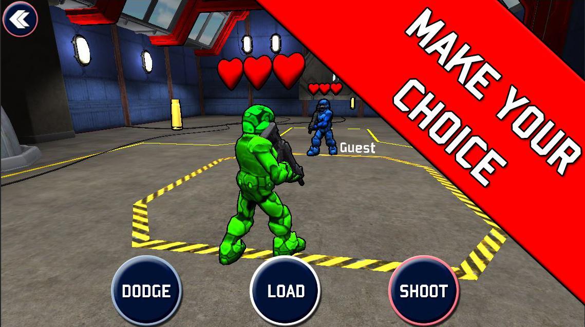 ผู้เล่นแต่ละคนจะต้องเลือกระหว่าง 3 ตัวเลือกในแต่ละเทิร์น - ยิง / โหลด / ดอดจ์ซึ่งการเลือกแต่ละครั้งสามารถตอบโต้ได้และให้ขอบของคุณ / คู่ต่อสู้ของคุณ