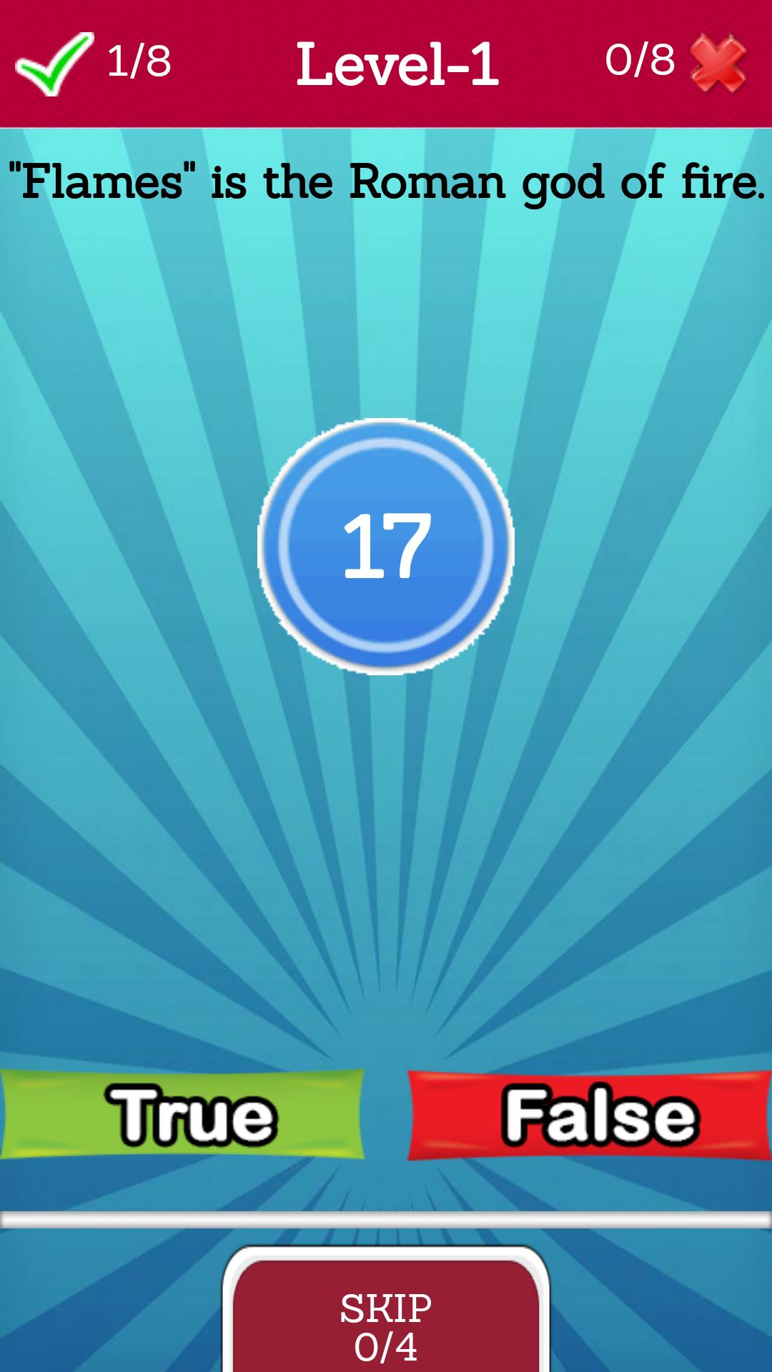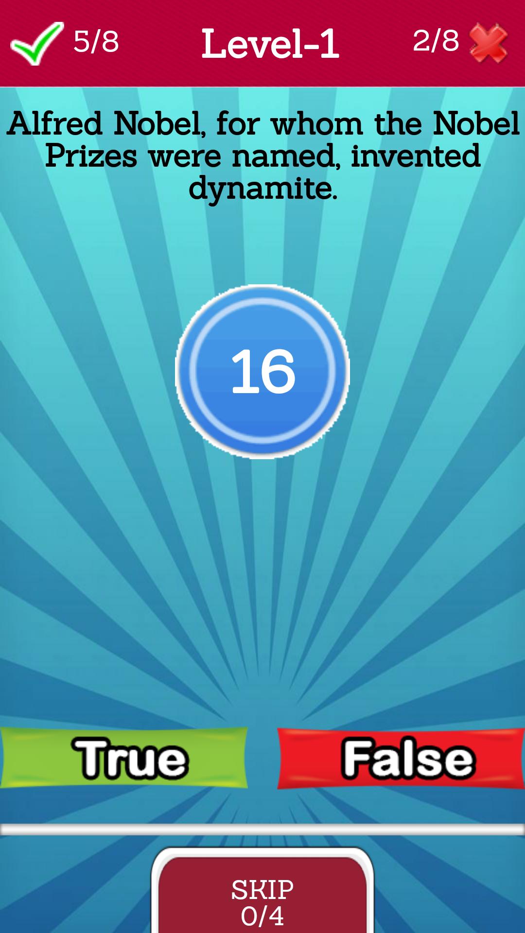 It's very simple to play True or False quiz , we think that is very addictive and have a nice gameplay. You don't need any briefing to play the game because just only have to hit the play button, select level and answer if the statement is good or not. This game will develop you the memory, abstract thinking and logical thinking and will teach you manny facts that probably you didn't know.