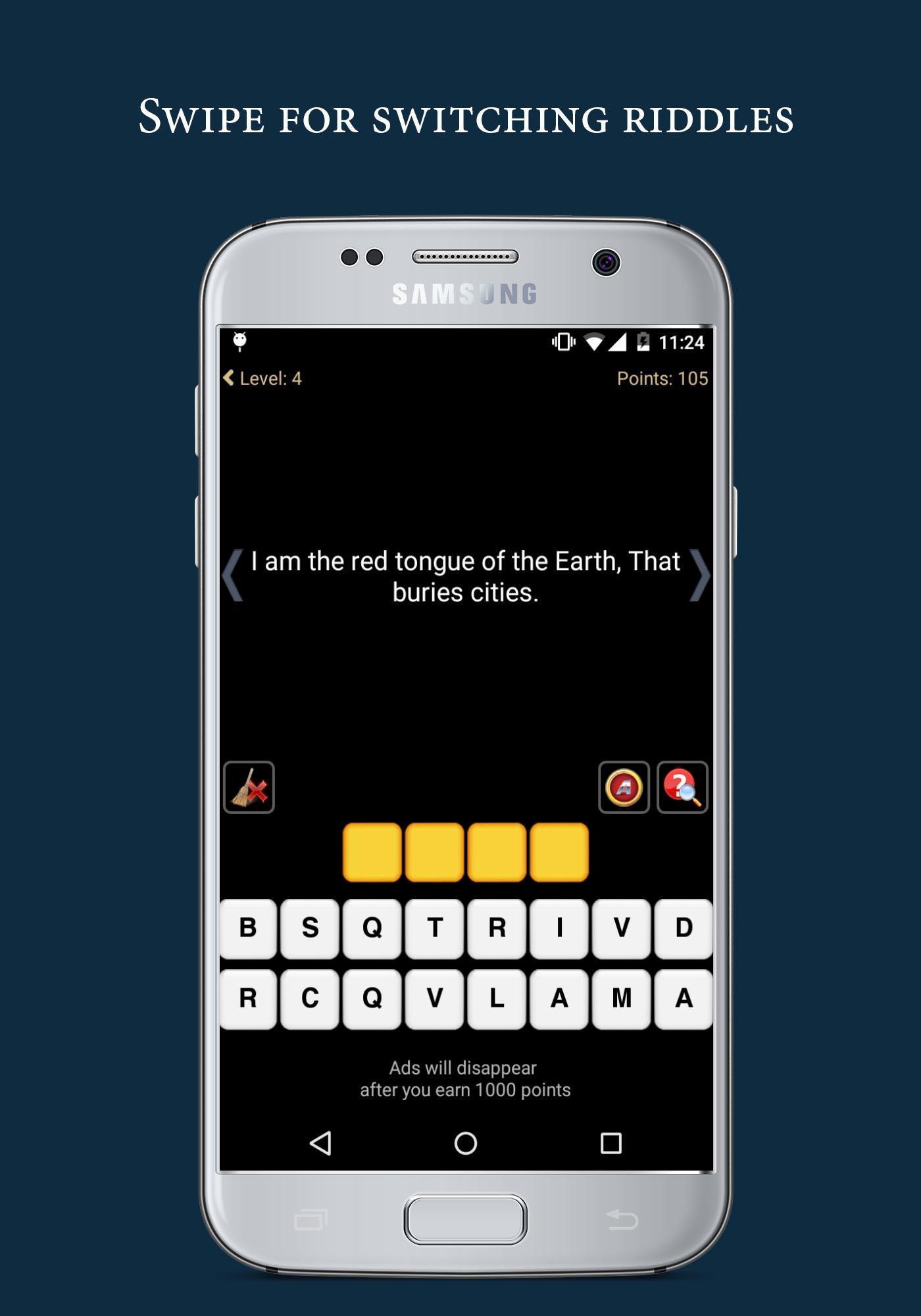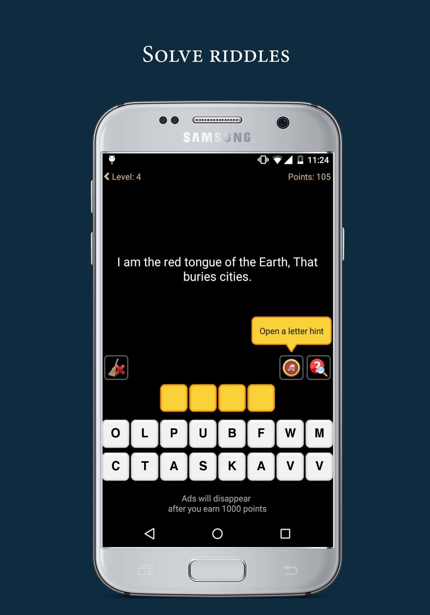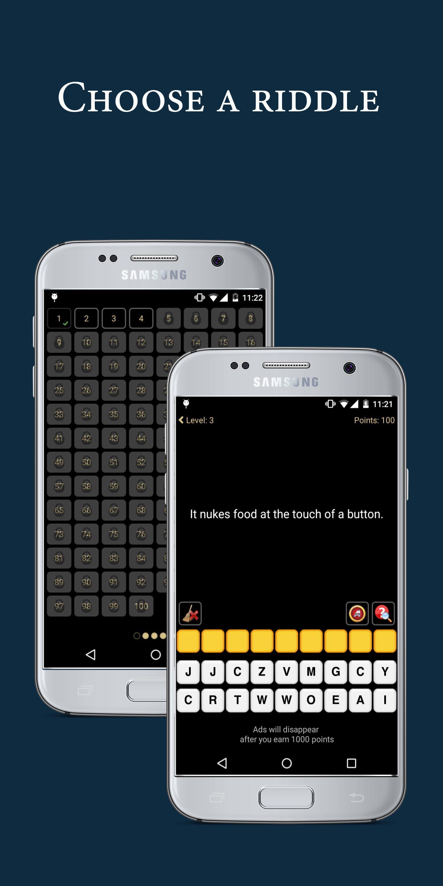- 当您赚取1000点时,广告会自动消失(需要在没有提示的情况下回答45个谜语)