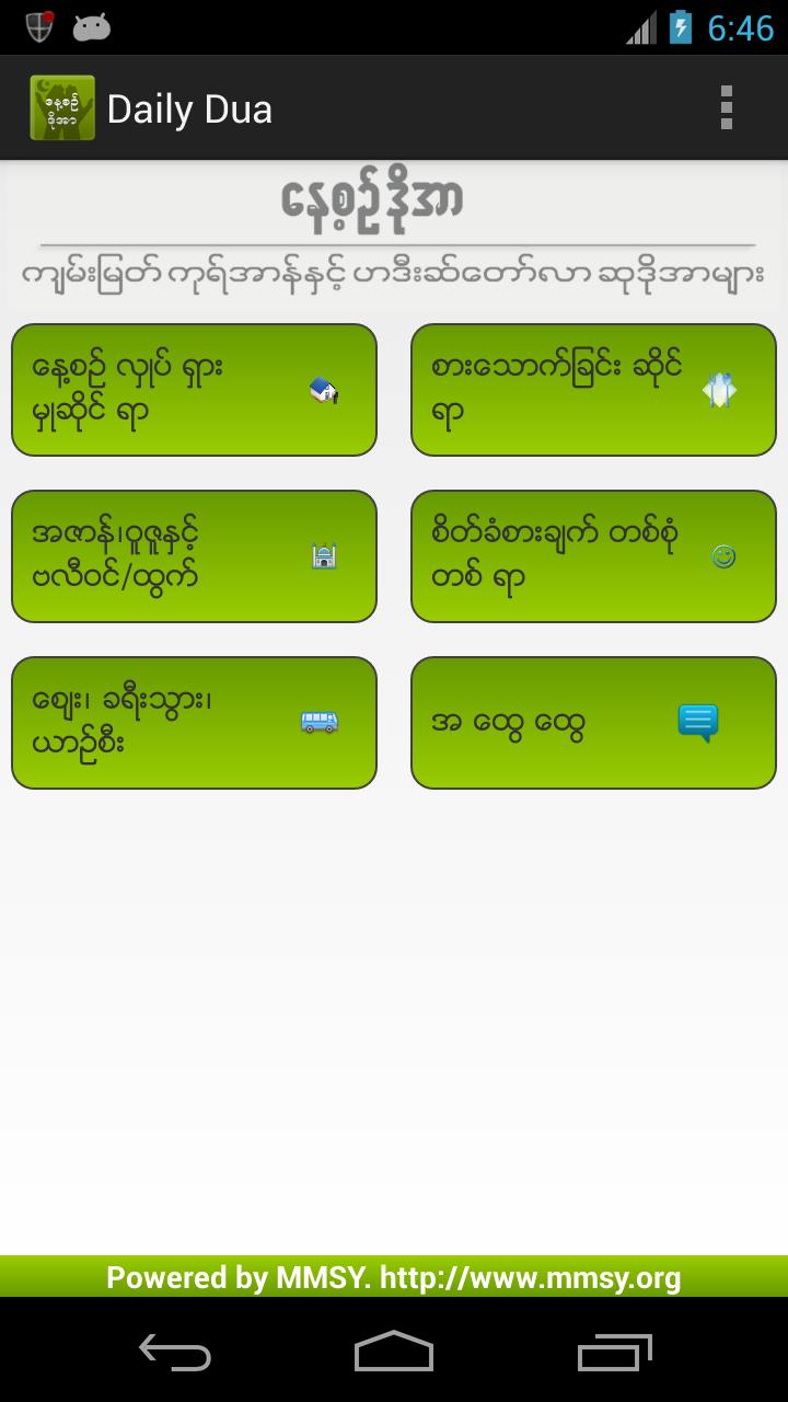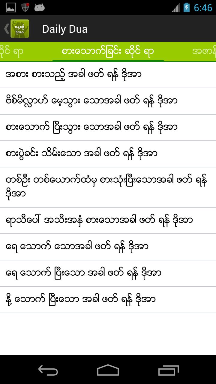 这是缅甸语言的DUA应用程序,它是我们日常生活中50种最常用DUA的汇编,以及阿拉伯文字,缅甸Tajwid,含义,描述和参考。它使您可以按类别浏览DUA,并将您喜欢的DUA保存在单独的列表中。该应用程序的原始来源来自某些圣训和书籍,被翻译成缅甸语言。这是由MMSY(缅甸穆斯林学生和青年)社区贡献的项目。