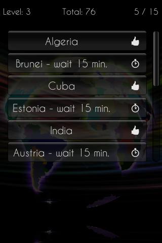 国旗和国家分为水平。每个级别都包含15个问题。目的是从四个可用选项中找到正确的答案。每个正确的答案给您1分。需要点来解锁下一级别。错误的答案阻止问题15分钟。您可以在那之后再试一次。