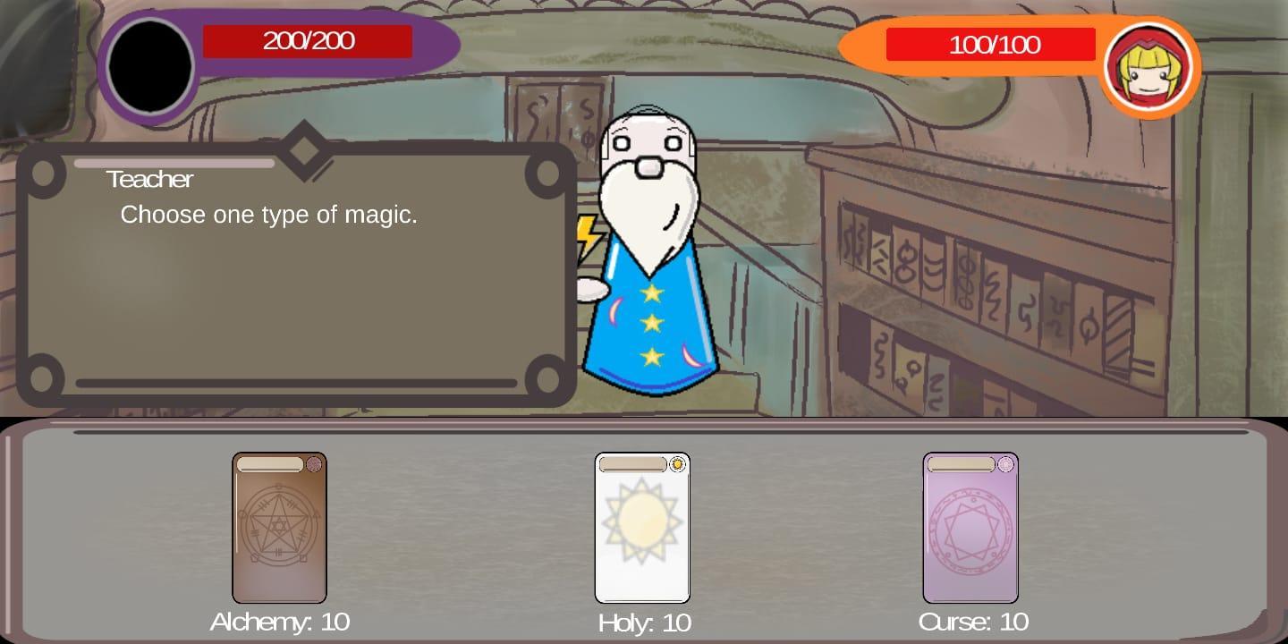 角色使用三种基本魔术来攻击:炼金术,圣魔法和诅咒。炼金术击败了圣魔法,圣魔法击败了诅咒,诅咒击败了炼金术。它遵循“剪刀,纸,石头”的基本规则。当玩家的HP变为0时,游戏结束了。