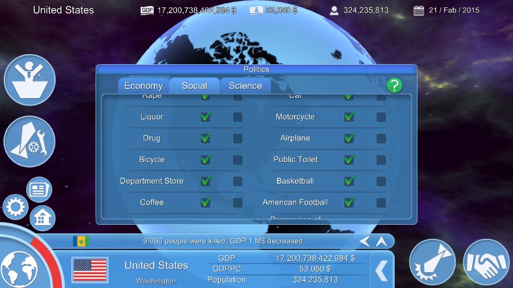 提供了三种游戏模式。其中两个目前可用,一个正在开发中。其中之一是“正常模式”没有什么特别的。另一个是“小行星冲击模式”。小行星计划在几年内与地球碰撞。许多国家将受到损害。您的国家可能是其中之一。另一个是“特殊功能模式”(在Devepopment下)。