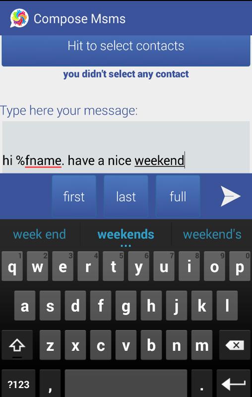 该应用程序将以“%fname”为单词,并将其替换为收件人的名字,因为它保存在手机上的联系人列表中。