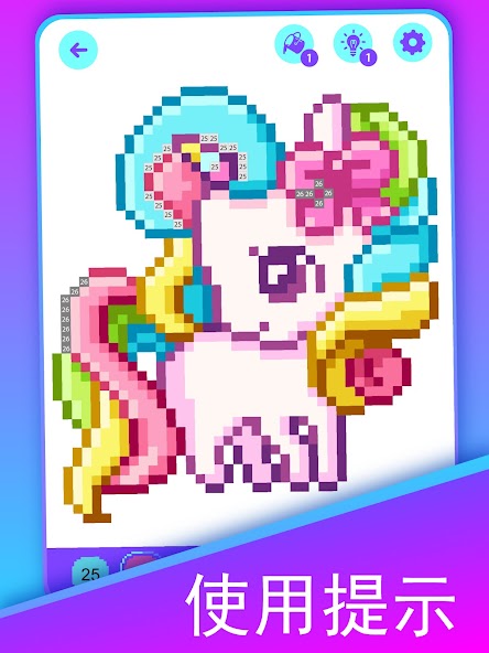 如何按数字绘画?很容易!只需用两个手指缩小图片,直到出现数字的单元格。通过Pixel选择带有匹配数字像素的调色板和颜色单元格中的颜色。独角兽像素着色游戏确实是男孩和男孩的有趣游戏。