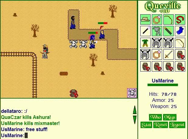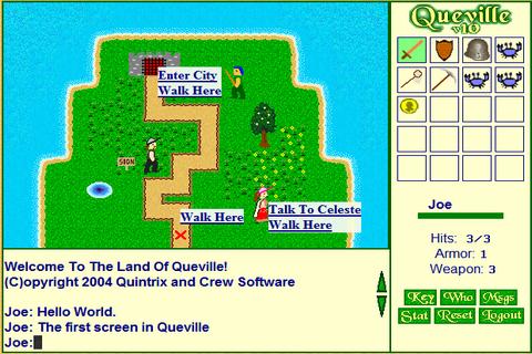 Queville是一款具有2D像素图形的多人角色扮演游戏,在屏幕上点击以移动您的头像,您可以单击“ Enter Enter City”和“ Attack Rat”之类的内容。