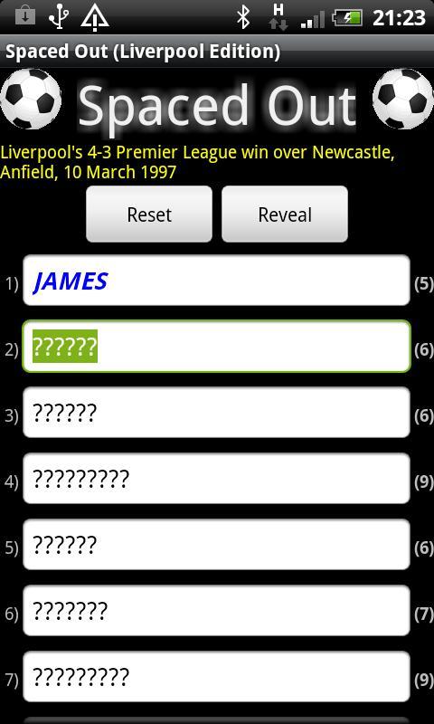 Spaceed Out是一款针对足球迷的琐事游戏。游戏的目的是通过将11个玩家的名称输入到游戏屏幕上的11个文本框中,以完成指定的比赛的首发阵容。在游戏开始时,每个玩家的名字通过问号(?)替换所有Alpha字符(A到Z)来掩饰。当将所有11个玩家名称正确输入11个文本框时,游戏就完成了。