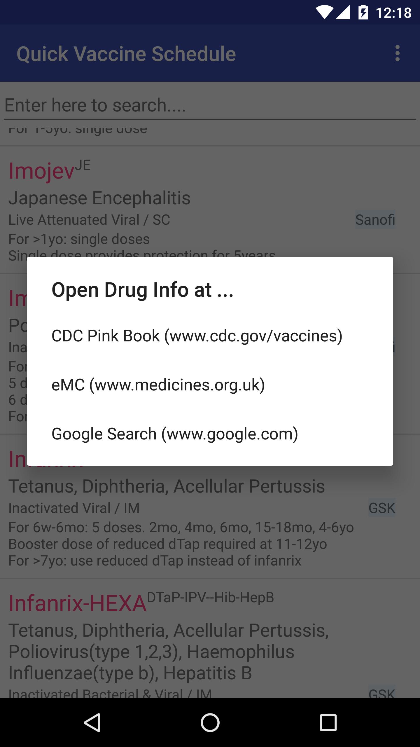 如果有長時間的單擊,則簡短點擊將帶您到EMC網站,這將帶您到CDC Pink Book網站以獲取疾病信息。